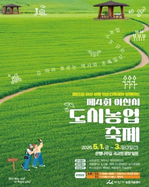 내고향뉴스 김명신 기자 | 아산시는 ‘제65회 아산 성웅 이순신축제’와 연계한 ‘제4회 아산시 도시농업축제’를 오는 5월 1일부터 3일까지 3일간 은행나무길 곡교천 광장 일원에서 개최한다.