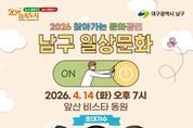 내고향뉴스 김명신 기자 | 대구 남구는 지역 주민들에게 일상 속 문화 향유 기회를 확대하고, 지역 예술가들의 공연 활동을 지원하기 위해 ‘2026 찾아가는 문화공연’ 을 개최한다. 관내 신규 입주 공동주택을 대상으로 공연을 희망하는 아파트 단지를 선정하였으며, 오는 4월 14일(화) 앞산비스타동원 아파트에서 첫 공연을 진행할 예정이다. 저녁 7시에 열리는 ‘앞산비스타동원 음악회’에서는 인기 개그맨 김재롱이 사회를 맡고, 지역 가수 이새벽과 미스트롯 4 출연자 장혜리 가수가 공연을 펼친다. 또한, 아파트 입주 후 처음으로 열리는 주민 참여 행사인만큼 입주자 대표회에서도 다양한 경품과 선물을 준비하여 주민 화합의 장을 만들 예정이다. 조재구 남구청장은 “대규모 축제나 행사도 중요하지만, 주민들이 사는 가까운 동네에서 편하게 문화예술을 접할 수 있도록 찾아가는 문화행정을 적극 추진하겠다.”라며, “아파트로 찾아가는 음악회를 통해 주민들이 일상에서 소소한 행복을 느끼며 힐링할 수 있기를 바란다.”라고 전했다. ‘찾아가는 문화공연’에 대한 문의는 남구 문화관광과 문화예술팀으로 연락하면 안내받을 수 있다.