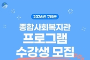 내고향뉴스 고광만 기자 | 2026년 구례군 종합사회복지관 프로그램 수강생 모집 배움과 건강, 취미가 함께하는 시간! 구례군민 누구나 무료로 참여할 수 있는 다양한 프로그램이 준비되어 있습니다. ✔ 모집기간: 2026. 2. 4.(수) ~ 2. 10.(화) ✔ 대상: 구례군민 ✔ 프로그램: 14개 과목 · 15개 반 ✔ 수강료: 무료 ✔ 접수: 종합사회복지관 방문 접수 문의: 061-780-2807 2026년 구례군 종합사회복지관 프로그램 강사 모집 당신의 경험이 누군가의 일상이 됩니다. 구례군과 함께 배움의 현장을 만들어주세요. ✔ 접수기간: 2026. 2. 4.(수) ~ 2. 10.(화) ✔ 강사료: 시간당 50,000원 ✔ 근무형태: 시간제 ✔ 접수방법: 방문 접수 접수처: 구례군 종합사회복지관 문의: 061-780-2807