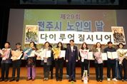 내고향뉴스 정미경 기자 | 100세 시대를 맞아 전주지역 노인들의 행복하고 건강한 노후생활을 함께 염원하는 노인의날 기념식이 열렸다. 전주시와 대한노인회 전주시지회(지회장 홍성언)는 14일 전주학생교육문화관 공연장에서 우범기 전주시장과 최주만 전주시의회 부의장, 김두봉 대한노인회 전북특별자치도연합회장, 표창 수상자 등 1200여 명이 참석한 가운데 ‘제29회 전주시 노인의날 기념식’을 가졌다. 송민주 대한노인회 전주시지회 사무국장의 사회로 진행된 이날 기념식은 △무지개예술자원봉사단(단장 고대현)과 아름다운 실버 전주의꽃(단장 김인식)의 식전 공연 △노인 강령 낭독 △청려장(장수지팡이) 수여 △전주시장 및 전주시의장 표창 수여식 △노인복지공로자에 대한 공로장 수여식 등의 순으로 진행됐다. 특히 우범기 전주시장은 이날 기념식에서 올해 100세를 맞이한 김옥순 어르신(여, 덕진동)에게 무병장수의 상징인 청려지팡이를 전달했으며, 홍성언 지회장은 축하의 꽃다발을 선물했다. 홍성언 대한노인회 전주시지회장은 “풍성했던 한가위도 지나가고, 땀과 노력으로 이뤄낸 결실의 계절 가을을 맞이해 참석해 주신 우범기 전주