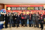 내고향뉴스 김익성 기자 | 포항시의회가‘2026 포항스틸러스 시즌카드’를 구입하며 올 시즌 포항스틸러스의 선전을 기원했다. 시의회는 23일 오전 의장실에서 김일만 의장을 비롯한 이재진 부의장, 상임·특별위원장과 포항스틸러스 김상락 사장, 이종하 단장, 박태하 감독 등이 참석한 가운데 ‘2026 포항스틸러스 시즌카드’ 구입행사를 열었다. 이날 행사에서 김 의장은 “항상 포항 시민과 포항시의회는 스틸러스와 함께하고 있다”며, “올 한해도 시민들의 응원을 받아 더욱 크게 성장하는 포항스틸러스가 되길 바란다”고 응원의 말을 전했다. 이에 포항스틸러스 김상락 사장은 “시즌카드 구매에 함께 해주신 모든 분들게 감사드린다”며, “올 시즌도 지역사회의 응원과 기대에 부응할 수 있도록 철저히 준비하겠다”고 화답했다.