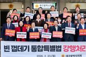 내고향뉴스 김익성 기자 | 대구광역시의회는 2월 23일 오전 11시, 대구시의회 1층 현관에서 대구경북 행정통합 졸속 추진 규탄 성명서를 발표했다. 이날 성명서 발표에 모인 대구시의회 의원들은 통합의 대의에는 공감하나, 권한과 재정이 비어있고 대표성의 균형이 무너진 졸속 통합에는 단호히 반대한다고 목소리를 높였다. 대구시의회가 2024년 12월 통합에 동의한 것은 대구·경북 양 의회가 충분히 협의하고 선거구 획정이나 의원 정수 문제도 조정할 수 있는 충분한 시간적·제도적 여지가 있었으며, 중앙 권한의 실질적 이양과 핵심 특례, 안정적 재정 기반이 법률로 담보되는 ‘진정한 통합’을 전제로 한 결단이었다. 하지만 지금 국회에서 추진되는 통합특별법 수정안은 그 취지나 방향이 현저히 달라졌다고 이번 성명서 발표의 배경을 밝혔다. 또한, 현재 국회 법안에는 긴급 재추진의 핵심 동력이었던 20조 원 규모의 정부 재정 인센티브가 언급조차 없고 재정 특례와 권한 이양의 주요 조항 역시 상당 부분 빠져 숫자만 요란한 ‘속 빈 발표’에 불과한 구체적 담보 없는 재정 약속으로는 통합의 실효성을 말할 수 없다고 강조했다