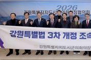 내고향뉴스 김익성 기자 | 2026년 강원특별자치도시군의회의장협의회 정기총회가 13일 춘천 세종호텔에서 열렸다. 이날 정기총회에서 최익순 협의회장(강릉시의회 의장)은 선진 지방의회 구현을 위해 노력해 온 한해를 돌아보고 공통 관심사에 대한 협업체제 강화 및 지방의정 발전 방안을 모색했으며, '강원특별법 3차 개정 조속 처리 촉구 건의문', '철원·춘천·홍천·횡성·원주 철도 '제5차 국가철도망 구축계획'반영 촉구 건의문', '지방교육자치법 개정에 따른 양양교육지원청 신설 촉구 건의문'을 의결하며 지역 현안 공동대응에 나섰다. 특히 최익순 협의회장은 '강원특별법 3차 개정 조속 처리 촉구 건의문'을 제안, '강원특별법 3차 개정안'이 발의한지 1년 6개월이 지나도록 계류되어 있어 정부와 국회의 특별자치도 정책에 대한 국민적 신뢰와 국가 균형발전 전략의 지속 가능성이 흔들릴 수 밖에 없다고 지적하며 ▲ 국회의 '강원특별법 3차 개정안' 즉시 심사 및 처리 촉구 ▲ 정부의 권한 이양과 규제 혁신이 포함된 제도 개선의 뒷받침과 특별법 개정 적극 협력 ▲ 강원특별자치도가 균발전의 실질적 모델로 자리잡을수 있는 후속 조